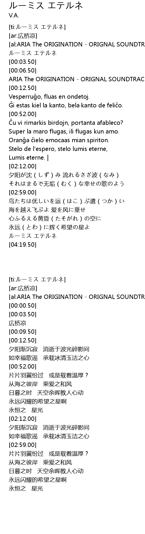 | [00:09.50] | ARIA The ORIGINATION ORIGNAL SOUNDTRACK tre Choro Club feat. Senoo |