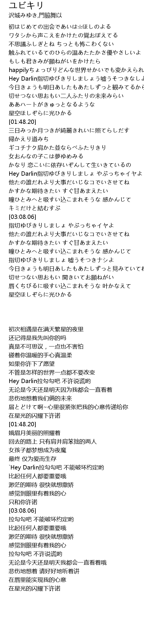 | [02:35.97] | Hey Darlin指切ゆびきりしましょ やぶっちゃイヤよ |