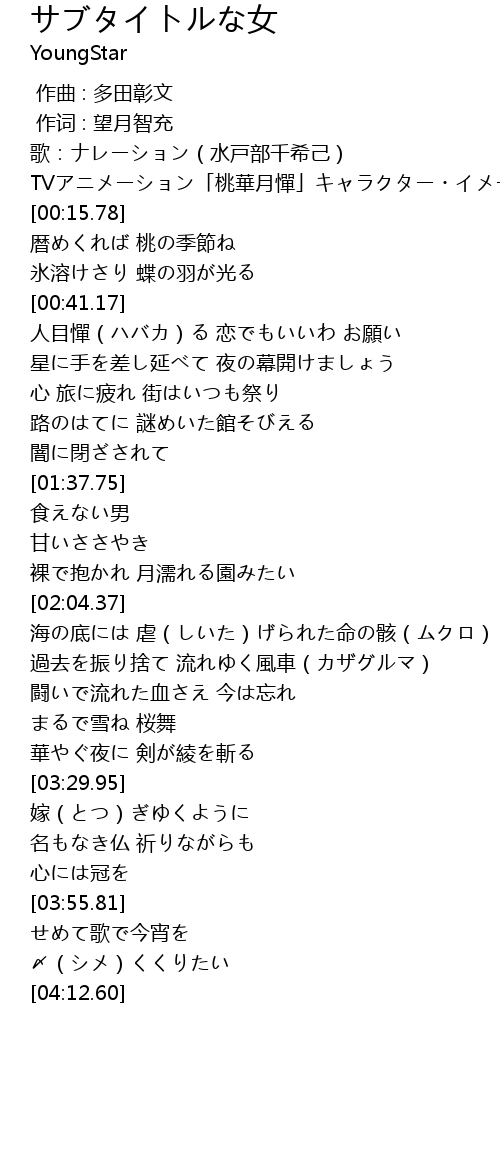 | [00:08.32] | 歌:ナレーション(水戸部千希己) |