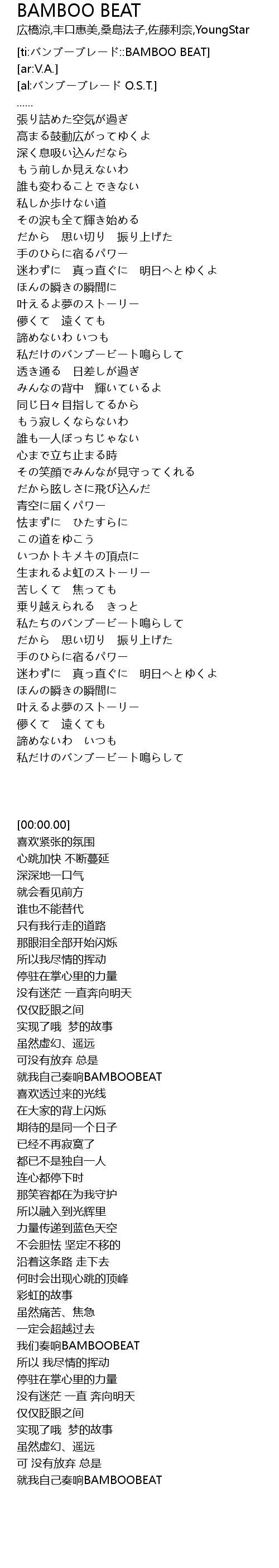 | [02:31.00] | 我们奏响BAMBOOBEAT |