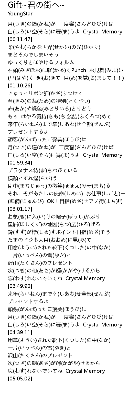 | [00:06.20] | 白(しろ)い空(そら)に舞(ま)うよ Crystal Memory |
