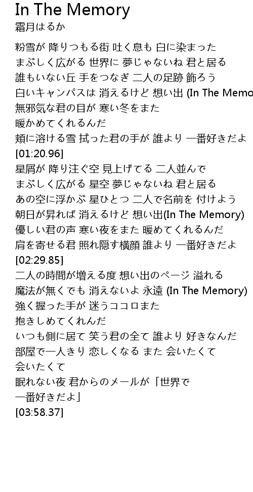 | [01:57.26] | 朝日が昇れば 消えるけど 想い出(In The Memory) |