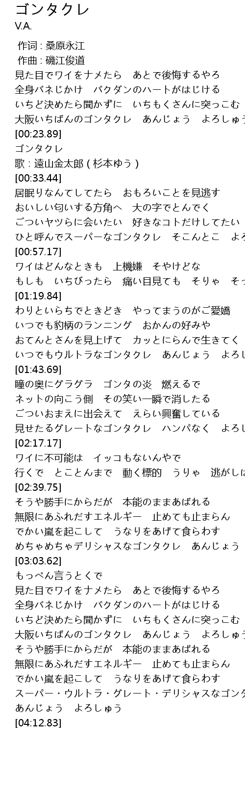 | [02:58.12] | めちゃめちゃデリシャスなゴンタクレ あんじょう よろしゅう |