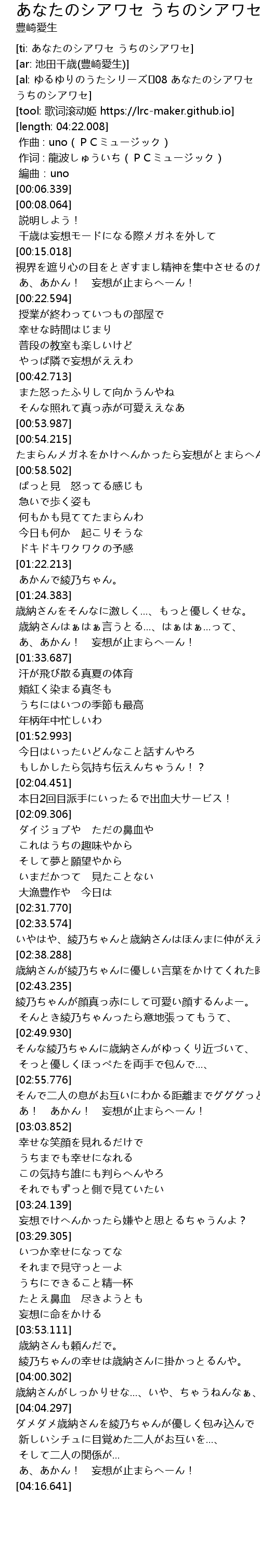 | 专辑 | ゆるゆりのうたシリーズ♪08 あなたのシアワセ うちのシアワセ (歌:池田千歳/CV:豊崎愛生) |