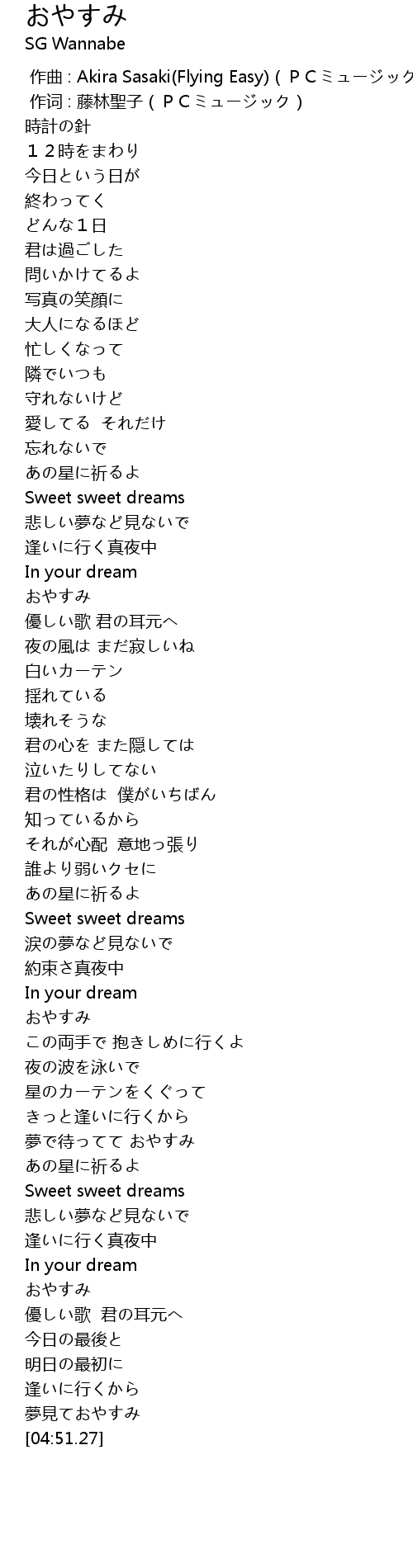 | [00:00.000] | 作曲 : Akira Sasaki(Flying Easy)(PCミュージック) |