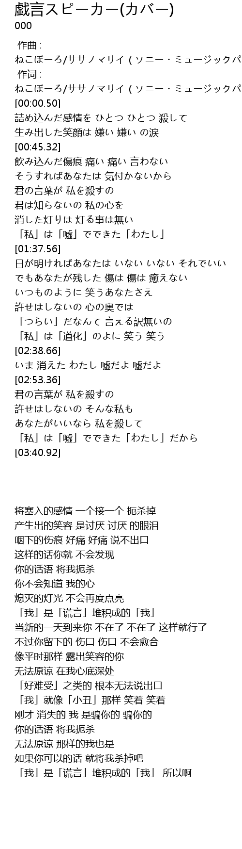 | [03:31.40] | 「私」は「嘘」でできた「わたし」だから |