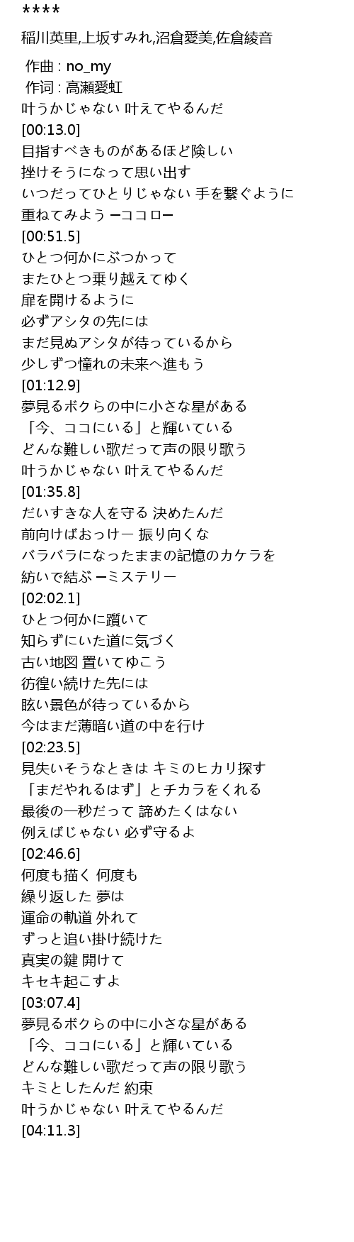 | [04:01.7] | 叶うかじゃない 叶えてやるんだ |