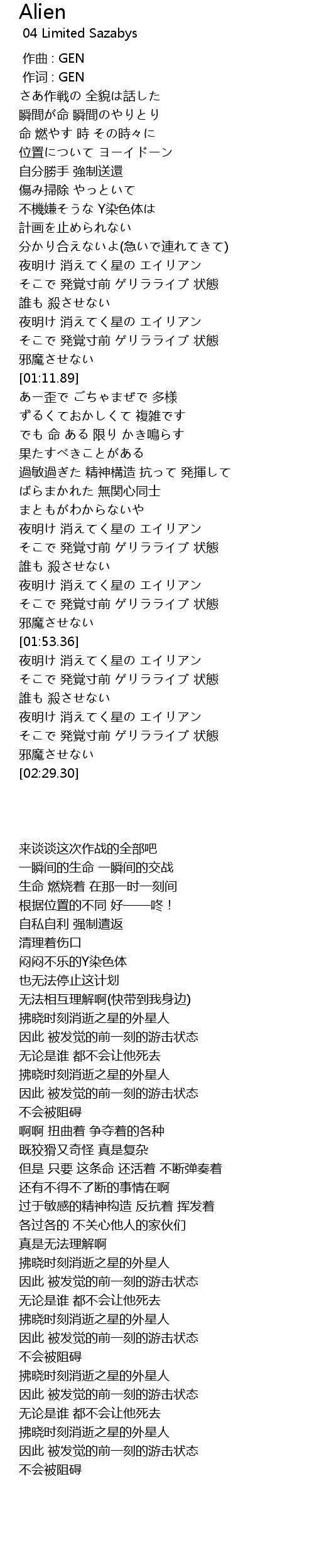 | [01:35.38] | 夜明け 消えてく星の エイリアン |
