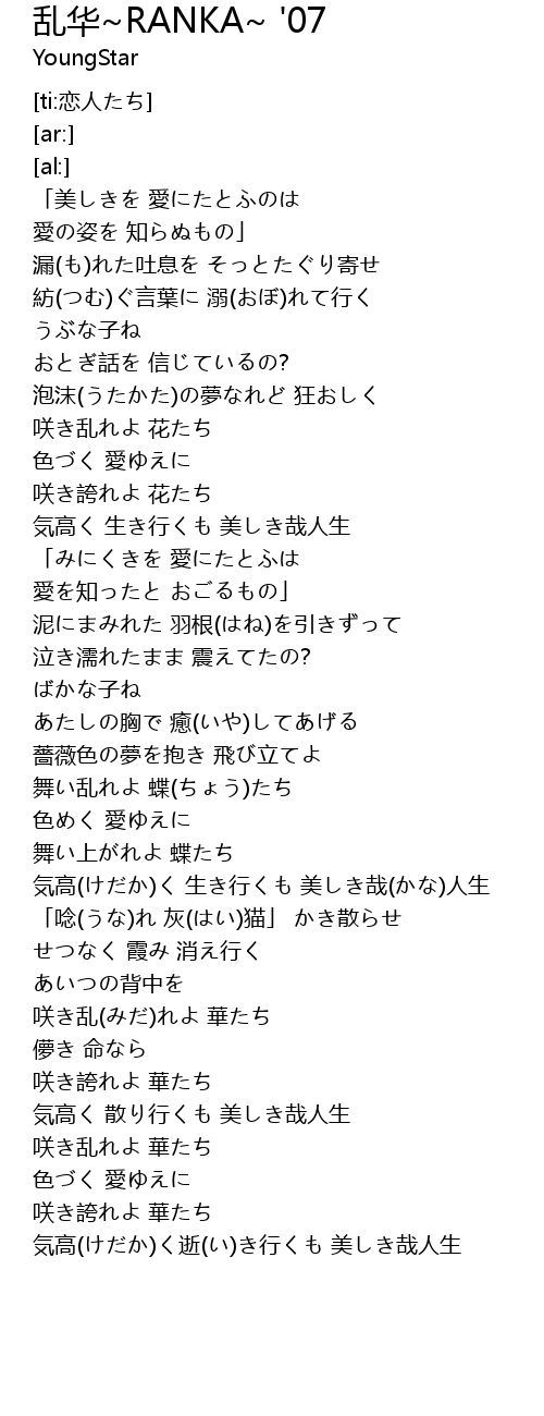 | [02:35.98] | 咲き乱(みだ)れよ 華たち |
