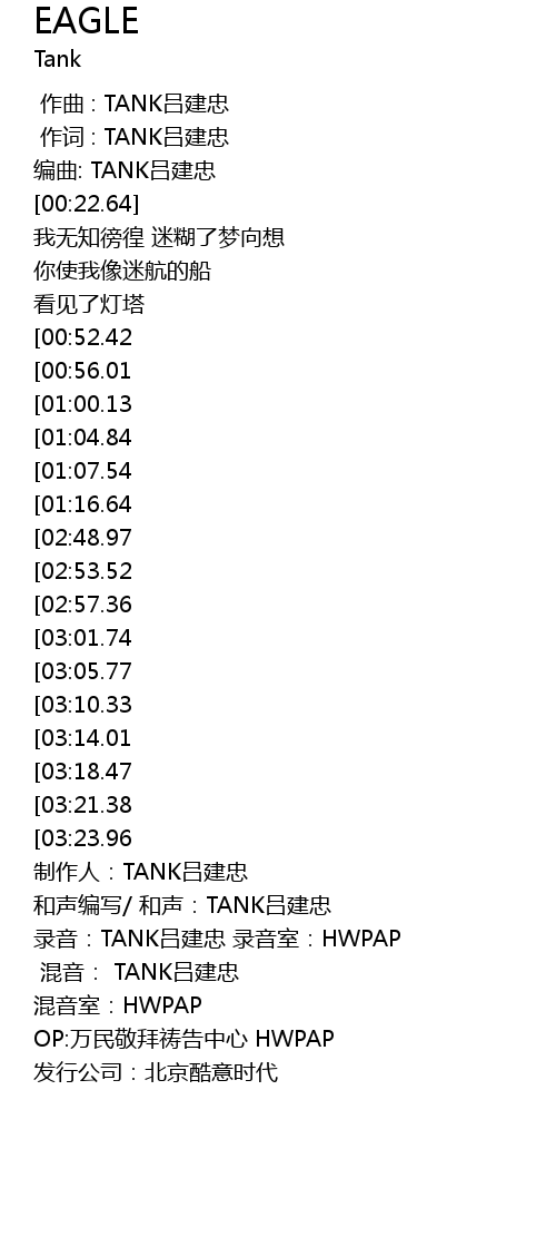 | [00:01.000] | 作词 : TANK吕建忠 |