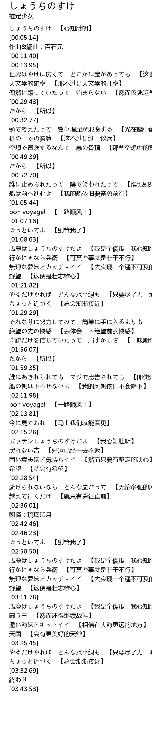 | [00:03.04] | しょうちのすけ 【心知肚明】 |