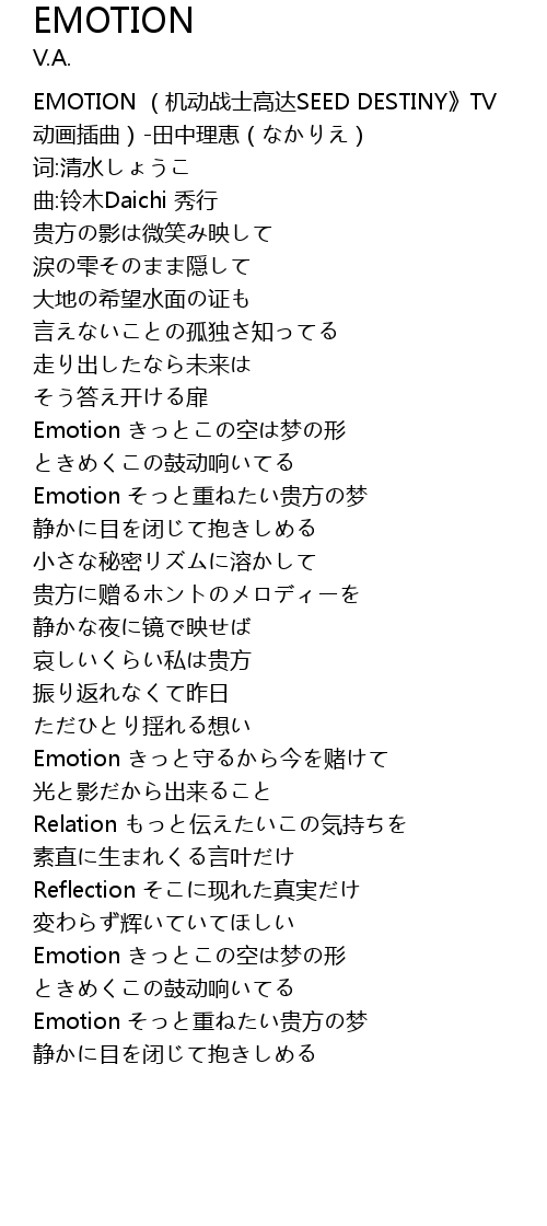 | [00:00.00] | EMOTION (机动战士高达SEED DESTINY》TV 动画插曲)-田中理恵(なかりえ) |