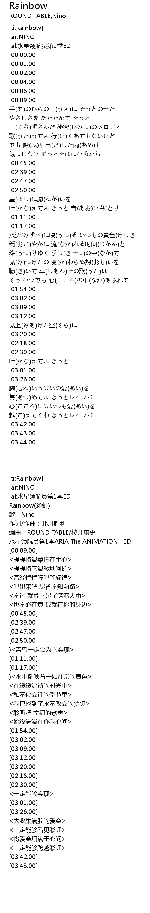 | [02:06.00][03:12.00] | <雨后的彩虹 抬头仰望天空> |