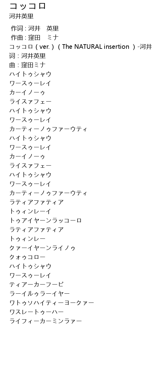 | [00:00.00] | コッコロ(ver.)(The NATURAL insertion )-河井英里 |