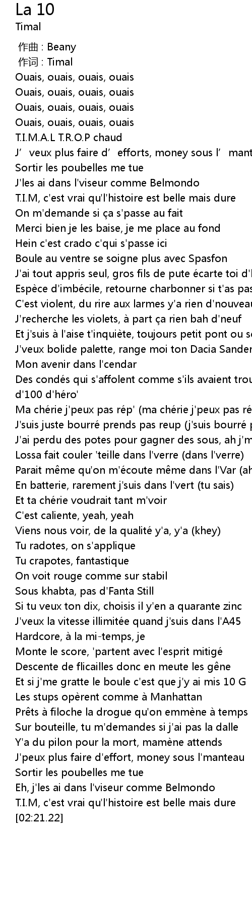 | [01:40.15] | Si tu veux ton dix, choisis il y'en a quarante zinc |
