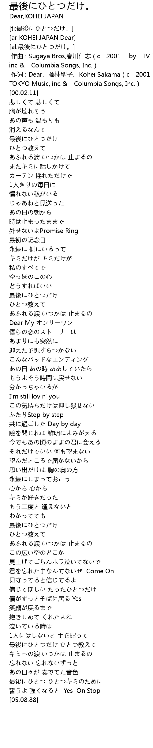 | [00:00.670] | zuò cí : Dear téng lín shèng zi Kohei Sakama c 2001 by TV TOKYO Music, inc. Columbia Songs, Inc. |
