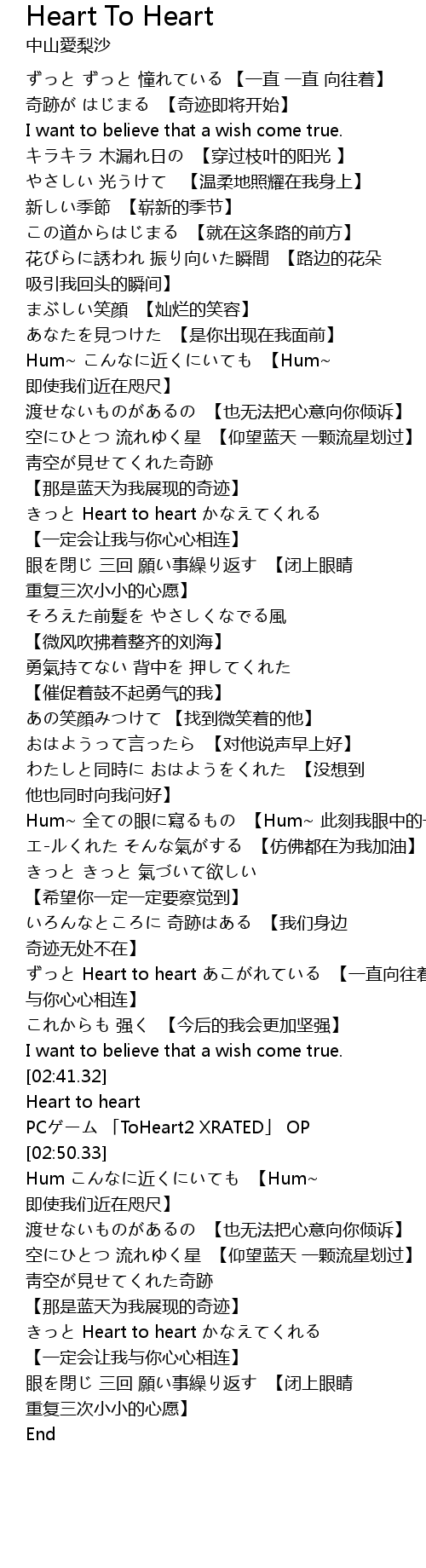 | [02:26.76] | ずっと Heart to heart あこがれている 【一直向往着 与你心心相连】 |