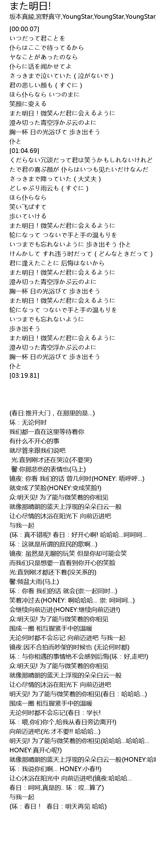 | [02:38.83] | 明天见! 为了能与微笑着的你相见(春日:哈哈哈...) |