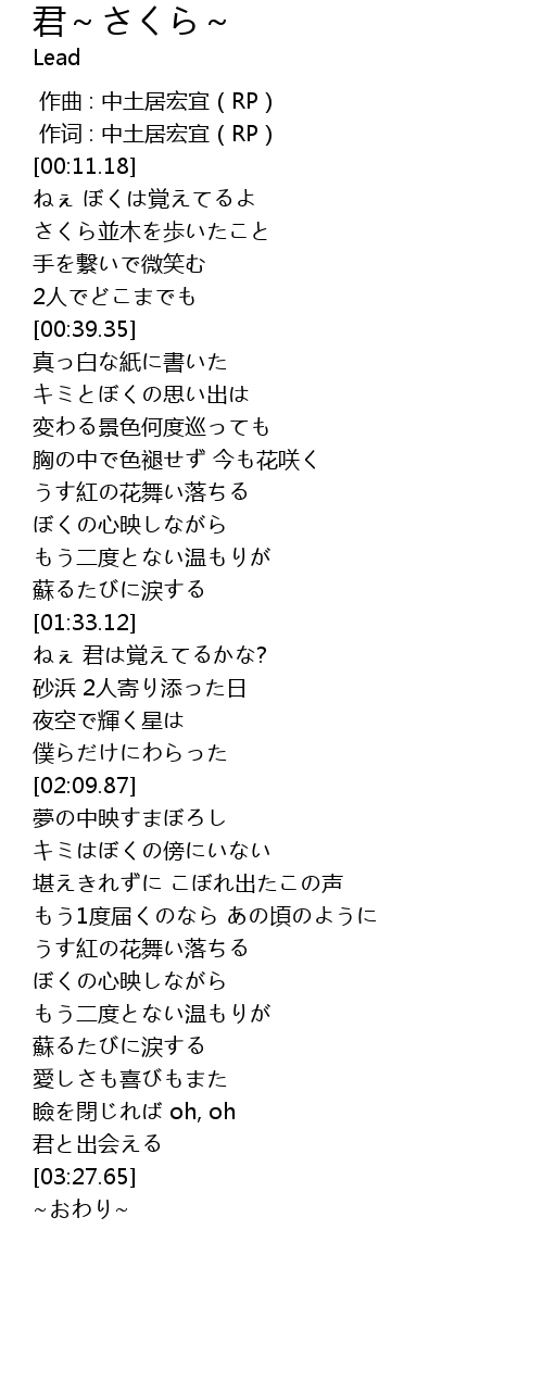 | [00:01.000] | 作词 : 中土居宏宜(RP) |
