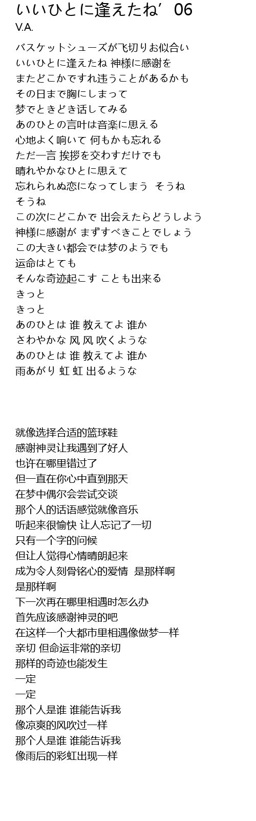 | [00:10.890] | いいひとに逢えたね 神様に感谢を |