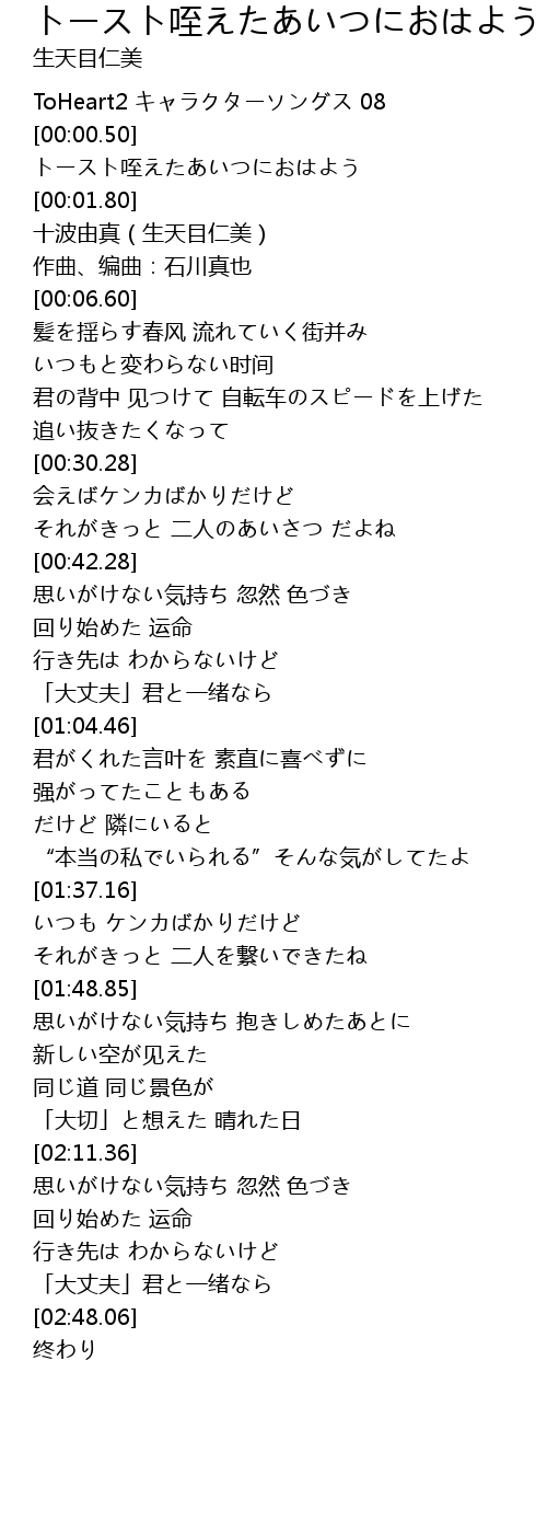 | [00:01.00] | トースト咥えたあいつにおはよう |