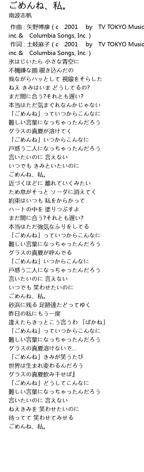 | [00:01.000] | 作词 : 土岐麻子(c 2001 by TV TOKYO Music, inc.& Columbia Songs, Inc.) |
