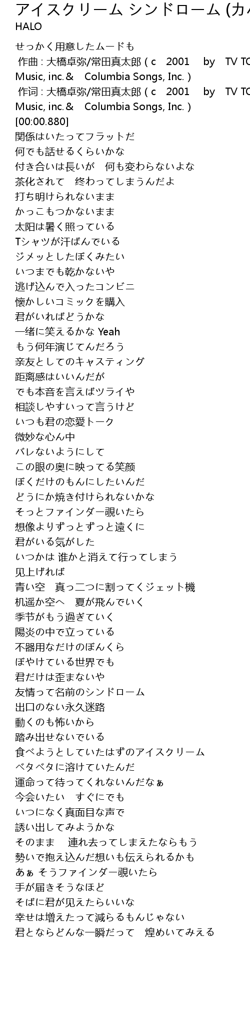 | [00:00.293] | 作词 : 大橋卓弥/常田真太郎(c 2001 by TV TOKYO Music, inc.& Columbia Songs, Inc.) |