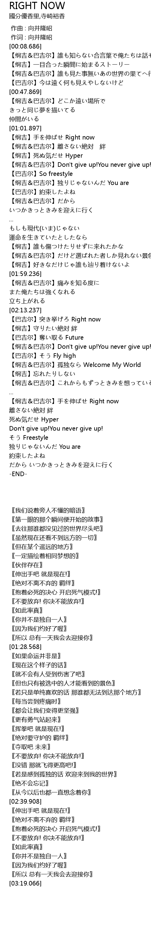| [02:13.342] | 【巴吉尔】突き挙げろ Right now |