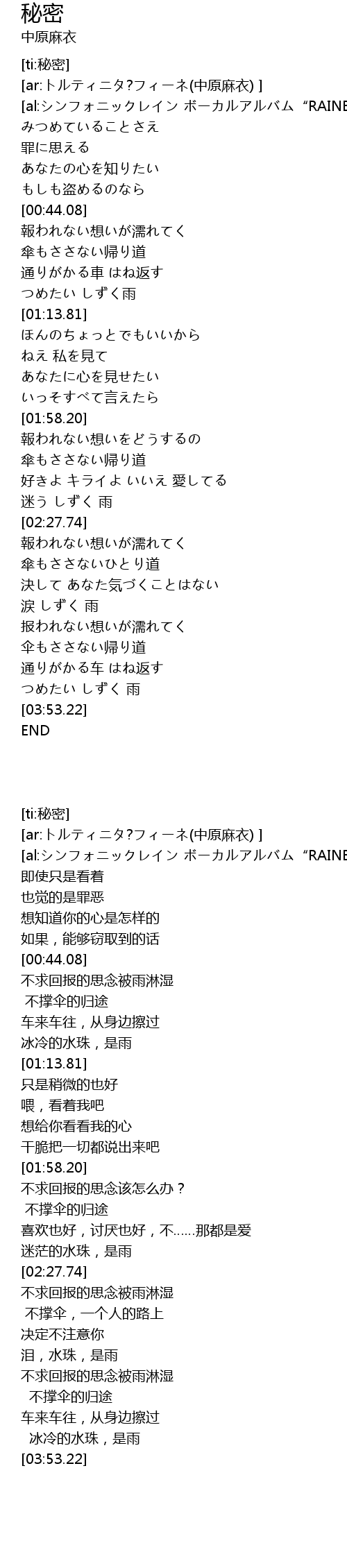 | [03:19.29] | 涙 しずく 雨 |