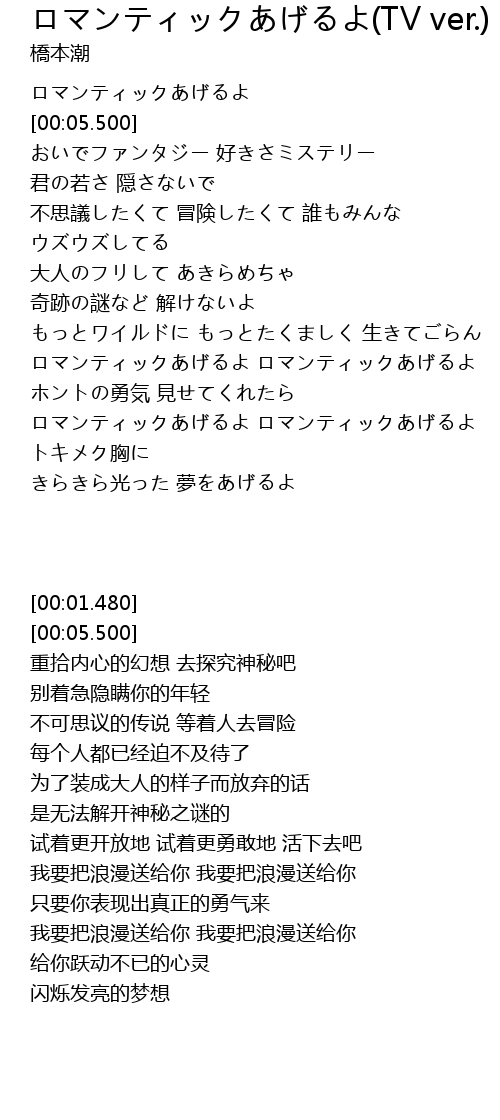 | [01:12.700] | ロマンティックあげるよ ロマンティックあげるよ |
