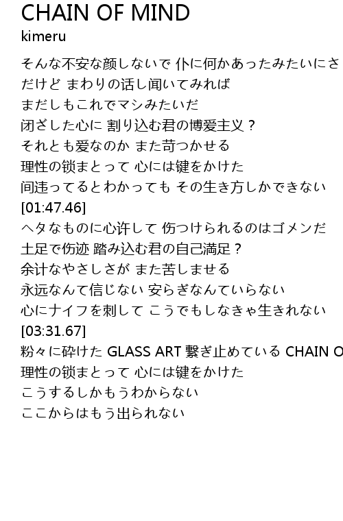| [03:38.34] | 粉々に砕けた GLASS ART 繋ぎ止めている CHAIN OF MIND |