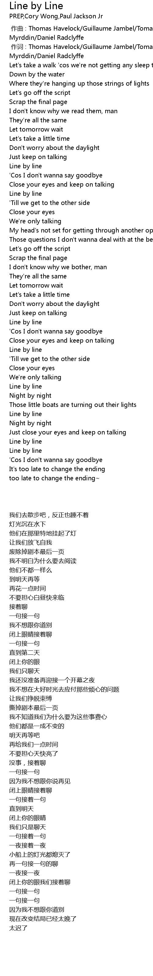 | [00:24.11] | Let' s take a walk ' cos we' re not getting any sleep tonight |