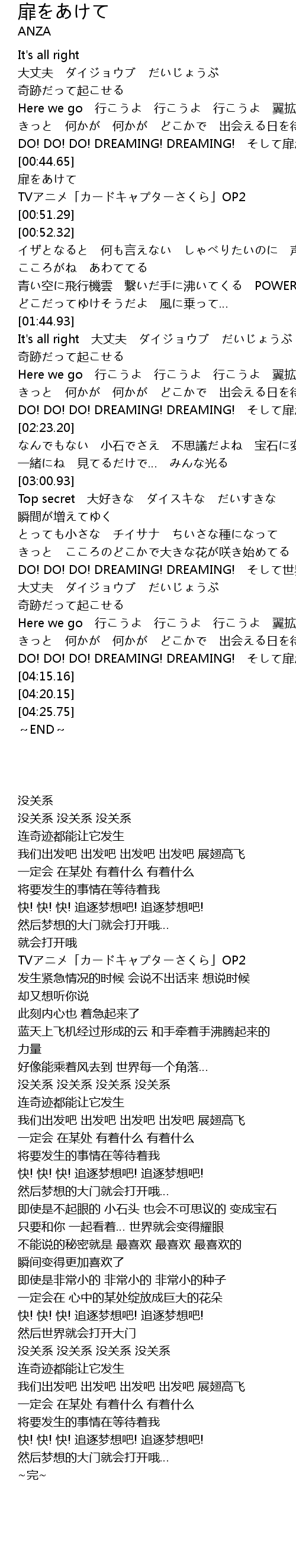 | [04:01.38] | 快! 快! 快! 追逐梦想吧! 追逐梦想吧! 然后梦想的大门就会打开哦… |