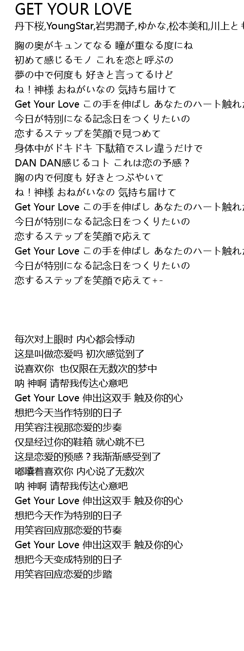 | [02:19.400] | Get Your Love この手を伸ばし あなたのハート触れたい |