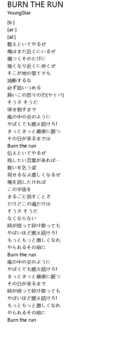 | [00:54.73] | 熱いこの怒りの刃(ヤイバ) |