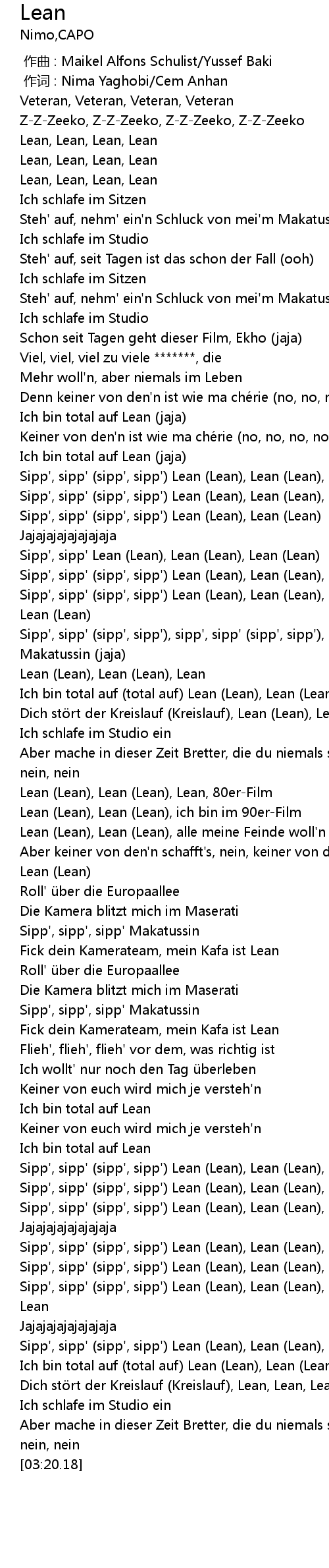 | [03:05.72] | Ich bin total auf (total auf) Lean (Lean), Lean (Lean), Lean |