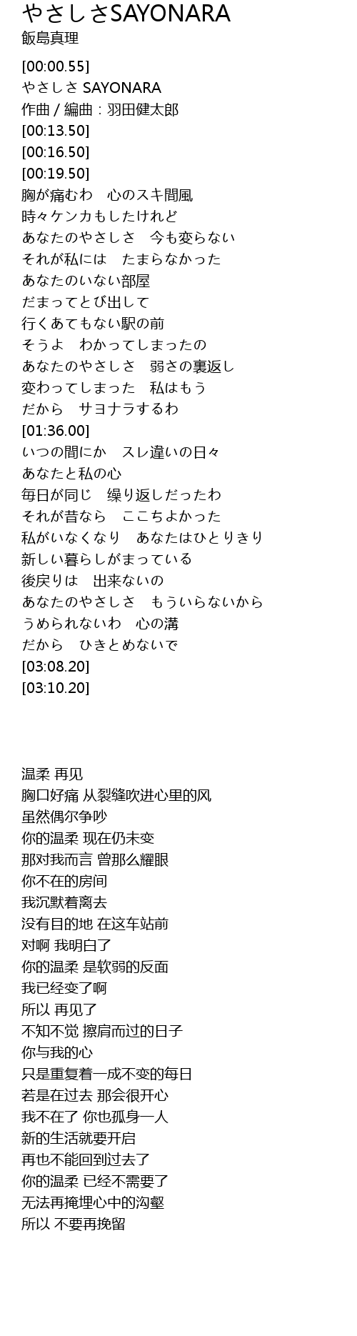 | [00:38.70] | あなたのやさしさ 今も変らない |