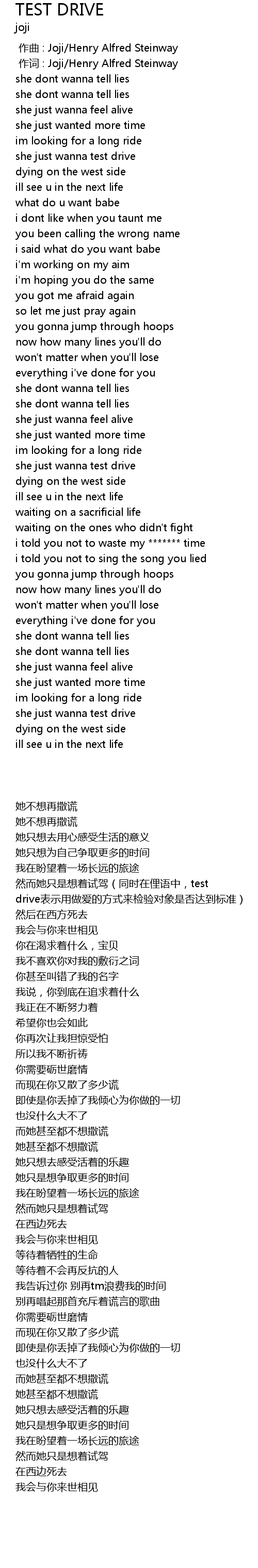 | [00:40.490] | 然而她只是想着试驾(同时在俚语中,test drive表示用做爱的方式来检验对象是否达到标准) |