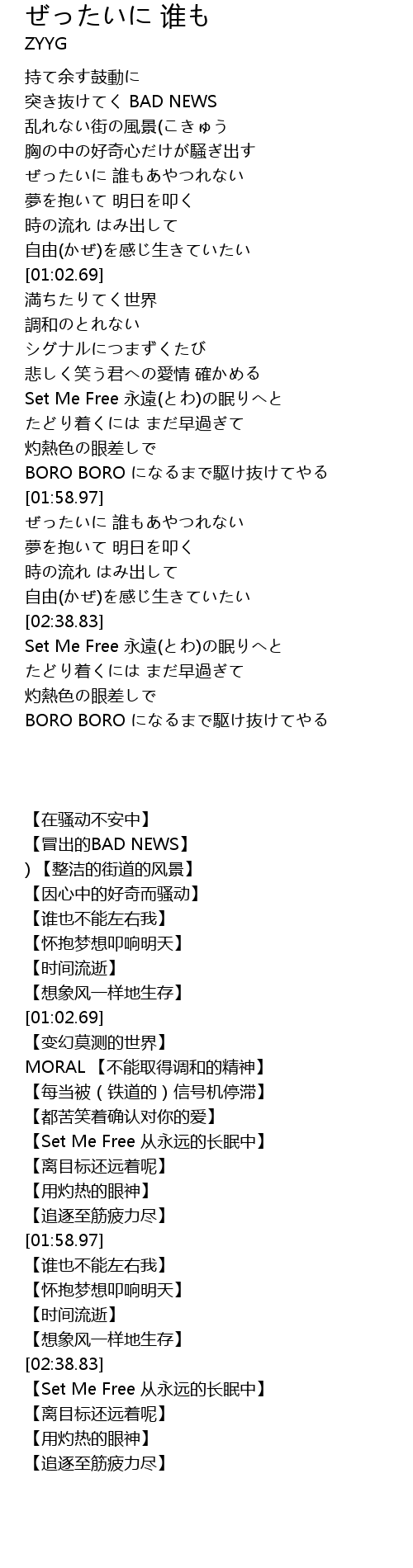 | [00:16.57] | 突き抜けてく BAD NEWS |