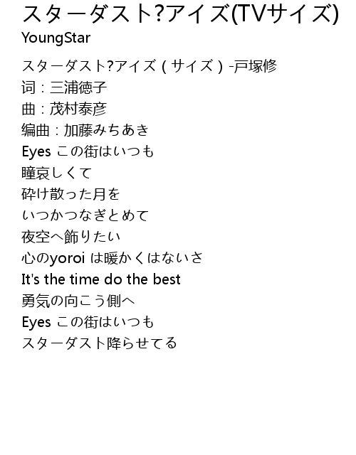 | [00:00.00] | スターダスト?アイズ(サイズ)-戸塚修 |