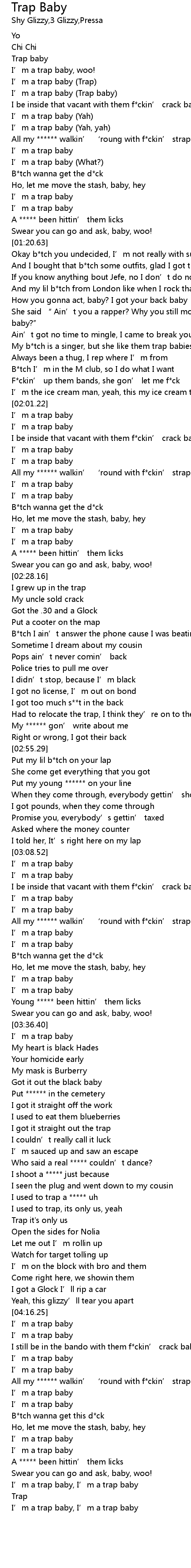 | [01:43.97] | My b*tch is a singer, but she like them trap babies |