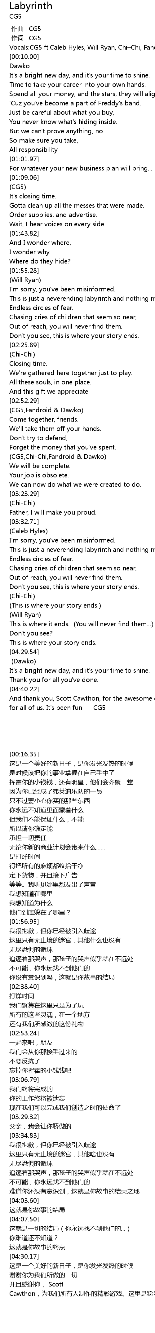 | [04:45.00] | 并且感谢你, Scott Cawthon,为我们所有人制作的精彩游戏。这里是粉丝- -CG5 |