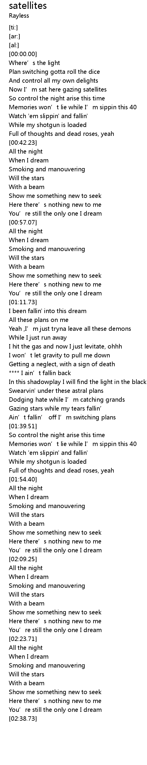 | [00:23.04] | Now I' m sat here gazing satellites |