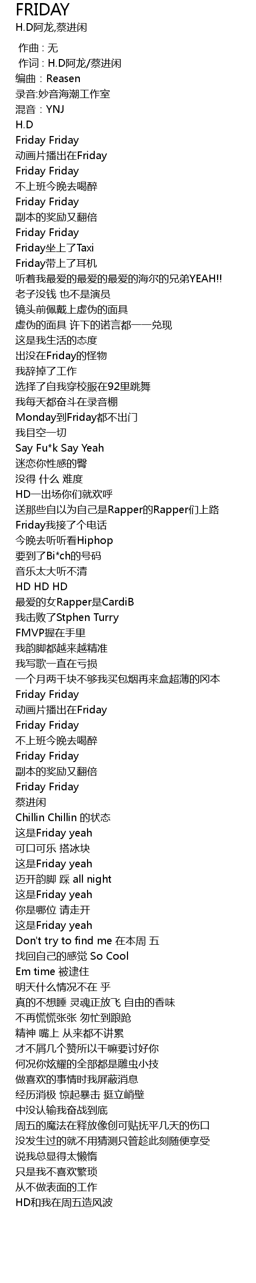 | [01:05.472] | Friday wǒ jiē le gè diàn huà |