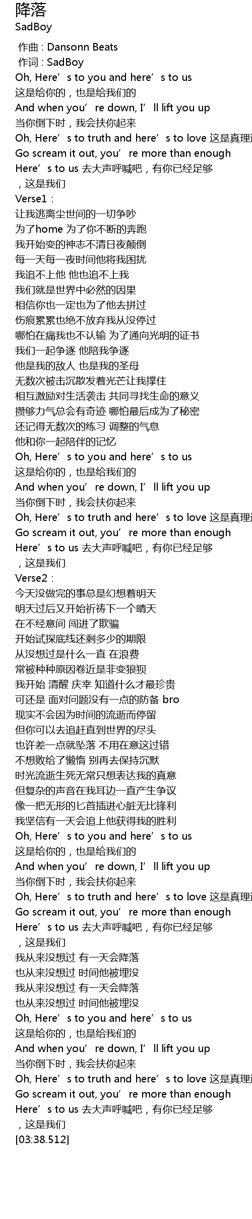 | [00:04.490] | And when you' re down, I' ll lift you up dāng nǐ dǎo xià shí, wǒ huì fú nǐ qǐ lái |