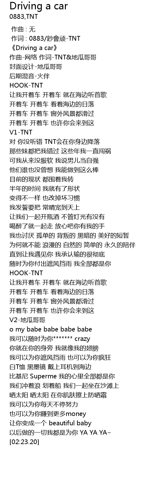 | [00:00.360] | 作词 : 0883/鈔會顽-TNT |
