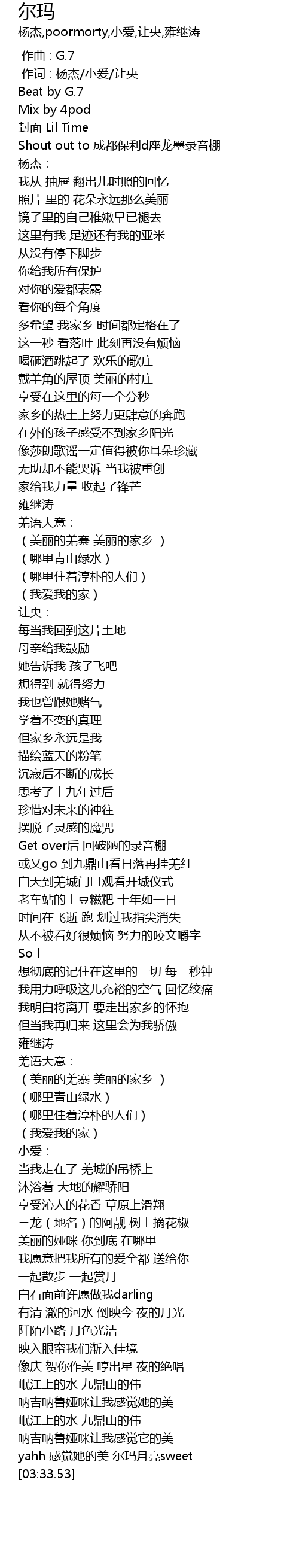 | [02:24.10] | (美丽的羌寨 美丽的家乡 ) |