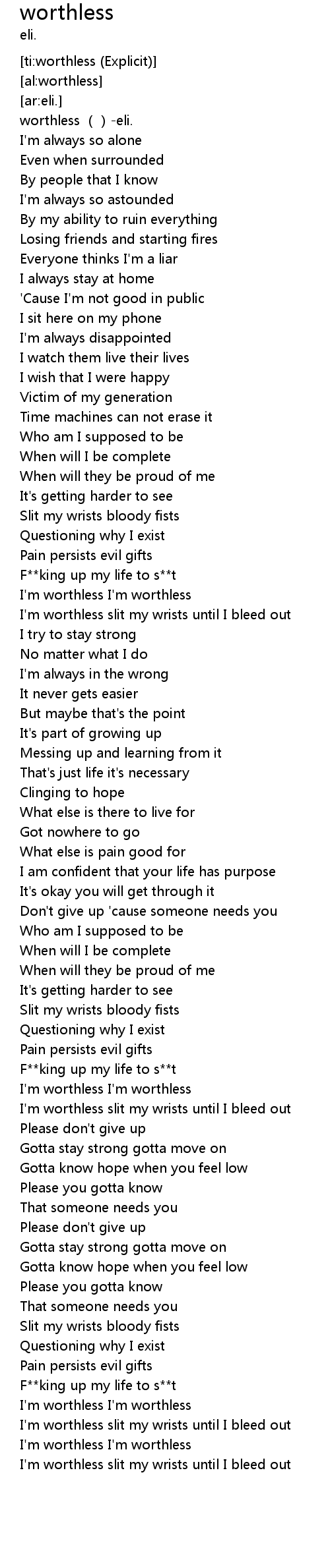 | [04:17.101] | I' m worthless slit my wrists until I bleed out |