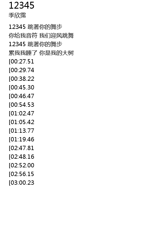 | [03:16.68][02:56.15][01:32.21] | 12345 跳著你的舞步 |