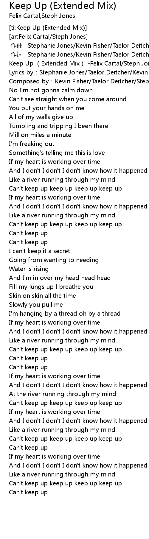 | [00:00.200] | Keep Up Extended Mix Felix Cartal Steph Jones |
